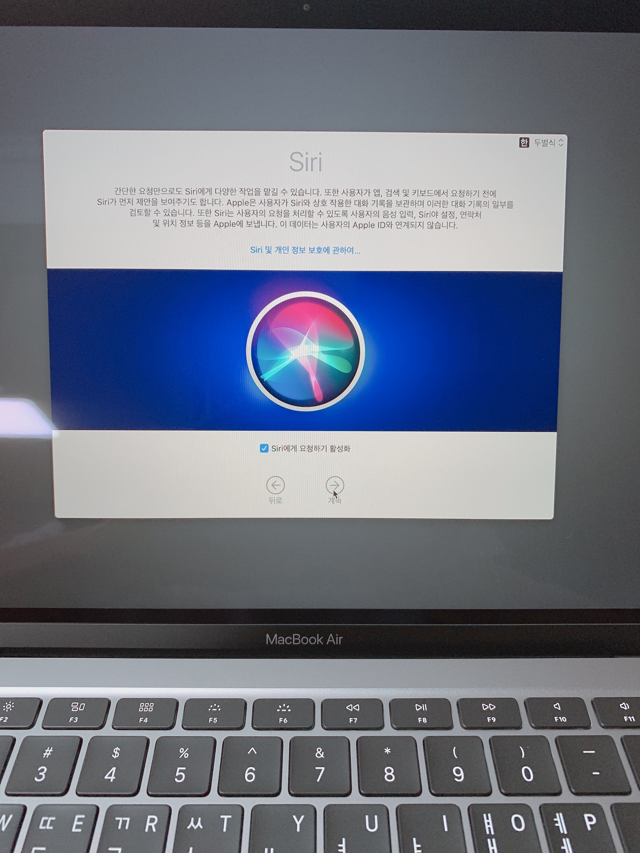 맥북에어를 처음 구입하고 개봉을 하면 자동으로 부팅이 됩니다. 그리고 기본 세팅을 시작하게 되죠. 기존 아이폰이나 아이패드 구입 시에 경험하신 절차이기에 그대로 진행하시면 됩니다.